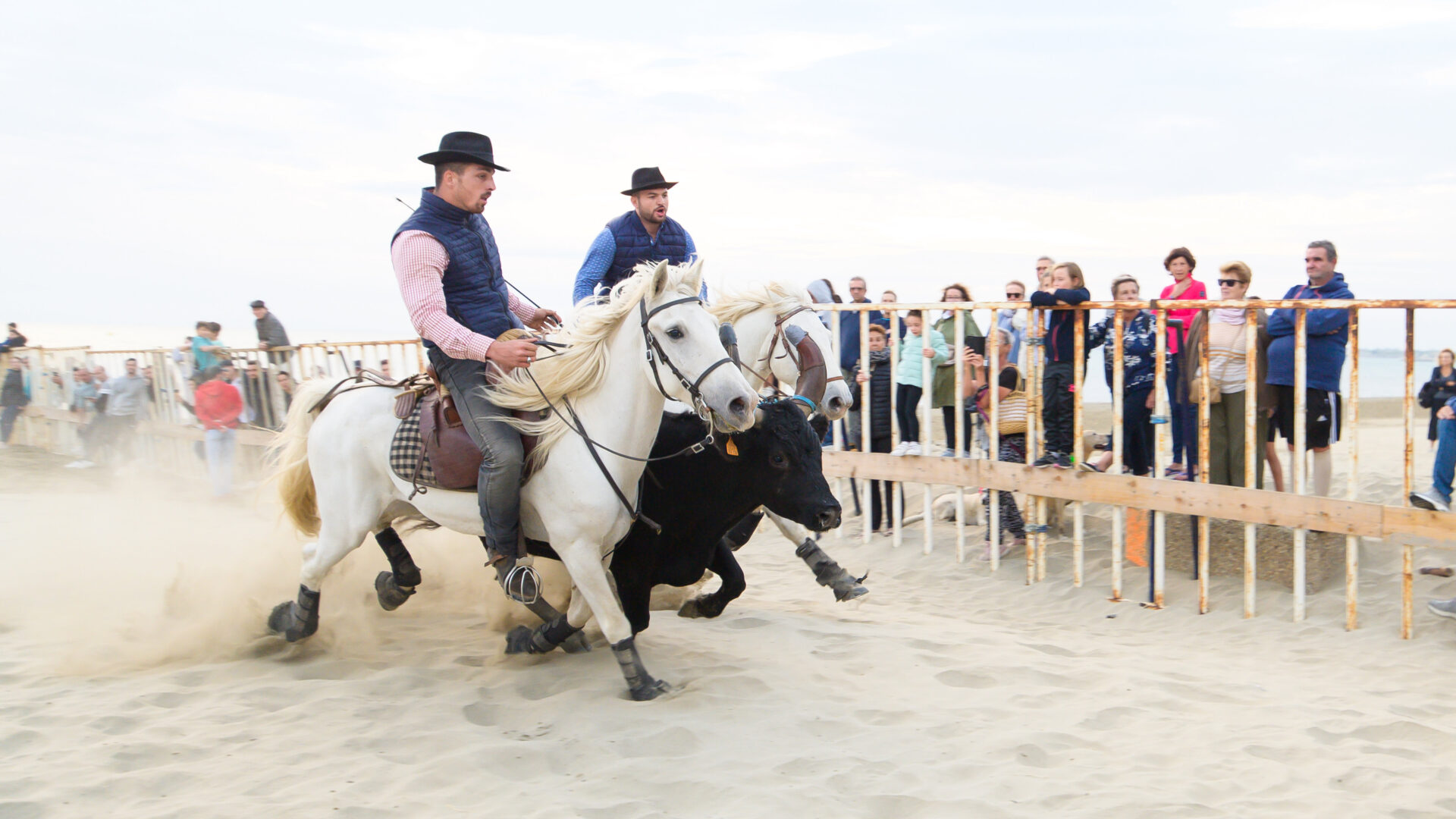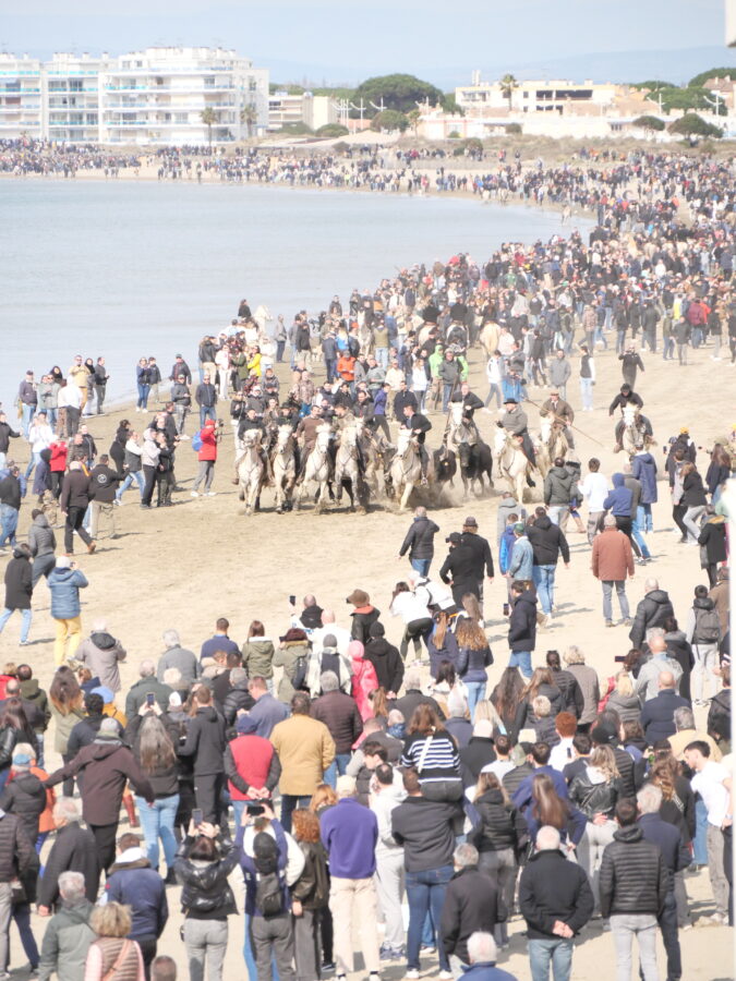 C’est le grand départ ! Les chevaux et les taureaux s’élancent depuis la plage du Boucanet. Ils vont longer la mer jusqu’à la « plagette » juste à côté de la Villa Parry. Préparez-vous, ça va aller vite !